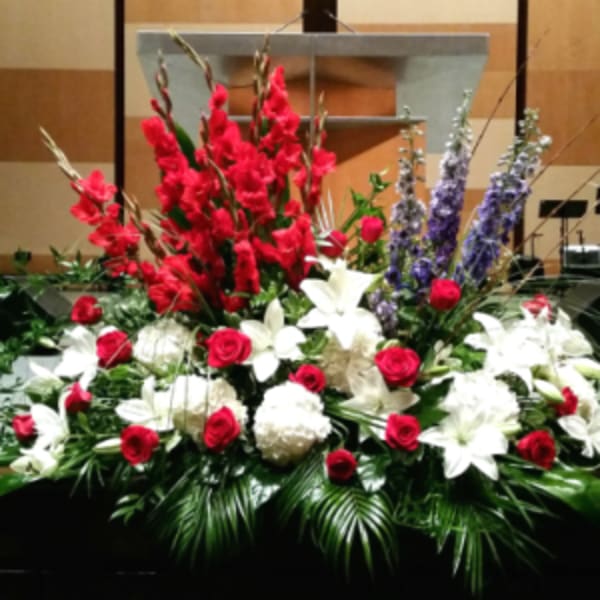 Price: $502.00 [TT-SPRAY33] GRAND SYMPATHY SPRAY IN WHITE WITH 2 PRINTED VERTICAL BANNERS BY TWIN TOWERS FLORIST, ARLINGTON VA Product Tags: Next-day Delivery